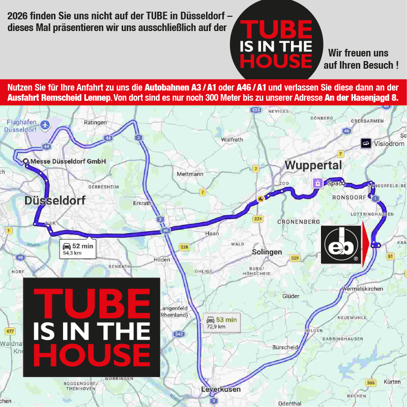in den zurückliegenden Wochen hatten wir bereits darüber informiert, dass unsere diesjährigen Messe-Aktivitäten in einem Tube-is-in-the House-Event gebündelt werden. Dieses Event findet in unserem Unternehmen statt, was den Vorteil hat, dass wir uns noch intensiver um Sie kümmern können.